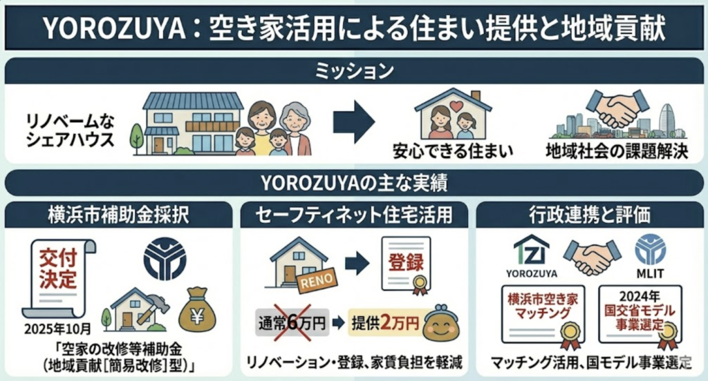 横浜市空き家マッチング制度の活用実績があり、2024年には国土交通省の「人生100年を支える住まい環境整備モデル事業」にも選定されるなど、その実績が行政にも認められています。