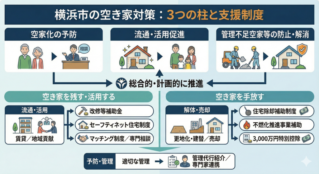 横浜市はこの3つを柱として、空き家対策を総合的かつ計画的に推進しています。