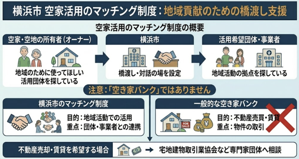 一般的に他の自治体でよく見られる、不動産売買や賃貸を目的とした「空き家バンク」とは異なり、横浜市の制度は地域活動での活用を目的とする団体や事業者との連携に重点を置いたマッチング支援です。不動産売却や賃貸を希望する場合は、宅地建物取引業協会などの専門家団体への相談が案内されています。