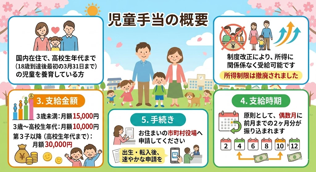 - 所得制限はありません! 親の収入がいくらであっても、対象年齢の子どもがいれば全員がもらえます。